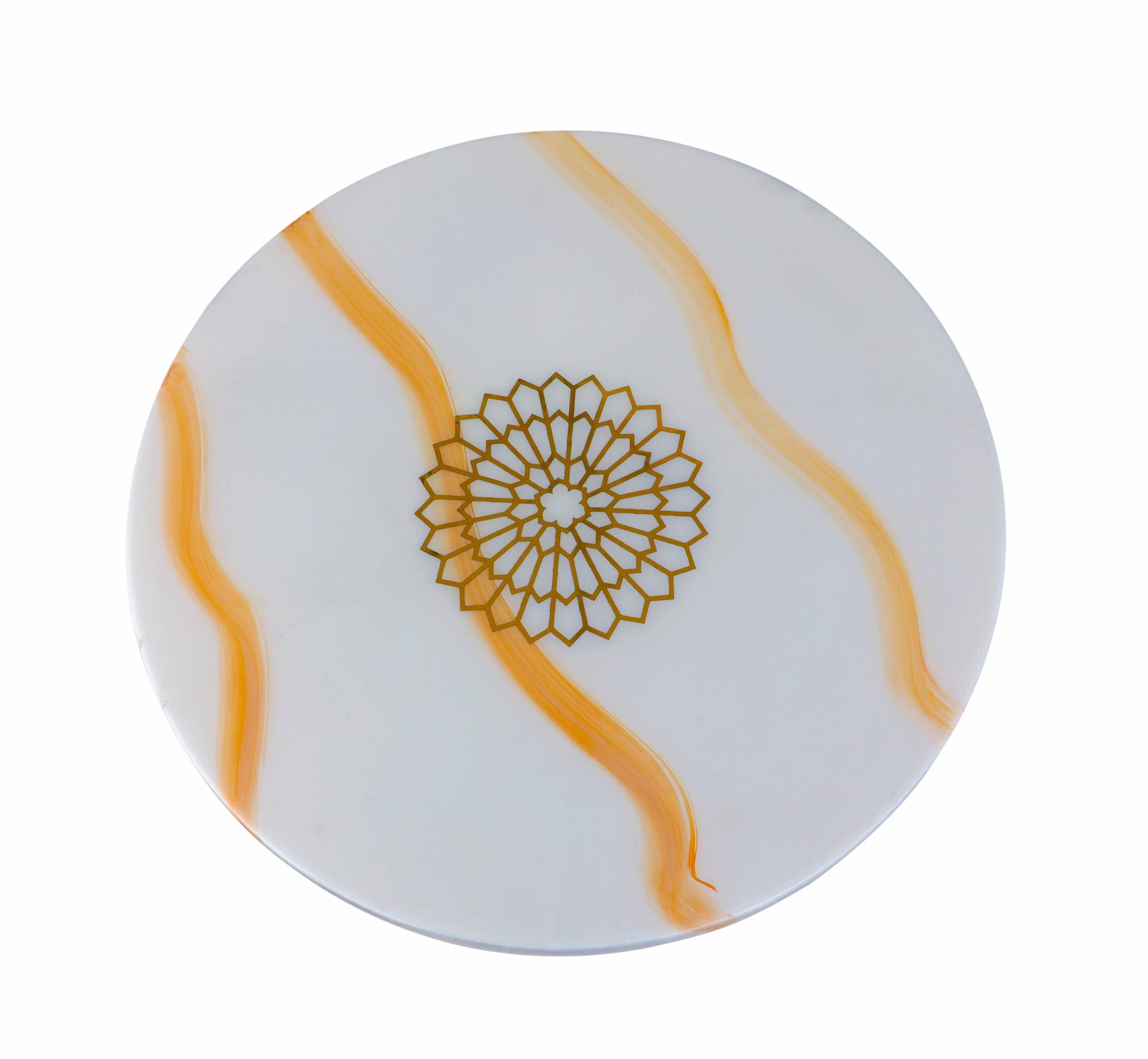 The Aurora Curve Accent Table is a refined statement piece featuring a soft ivory, marble-inspired surface crafted from wood and finished with a smooth resin coating. Subtle veining and a delicate central motif add artistic elegance, while the glossy finish enhances depth and durability.