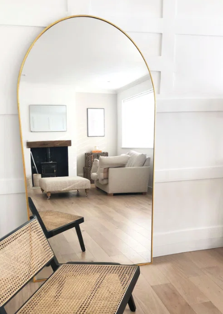 Introducing the Grand Classic Arch Mirror - an oversized full-length mirror framed in a timeless gold arch design. With its elegant curves and adjustable base, this mirror is perfect for bringing a touch of luxury to your home. Elevate your décor and add a touch of sophistication to any room.